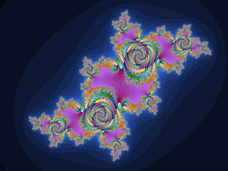 This will open a window with a rendering of the Mandelbrodt set, and display some instructions for tweaking the output. Press the J key to switch from the Mandelbrodt set to the Julia set, then play around with colors. Here's an example of what the output can look like after tweaking some of the parameters. julia_set.png